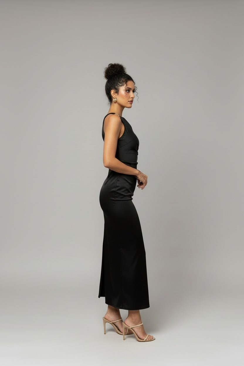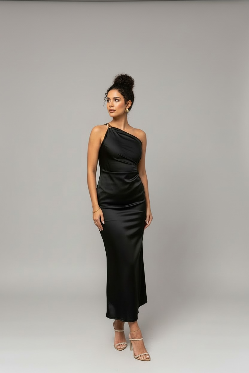 Μάξι σατέν φόρεμα με έναν ώμο και χρυσή αγκράφα που προσθέτει λάμψη και κομψότητα.